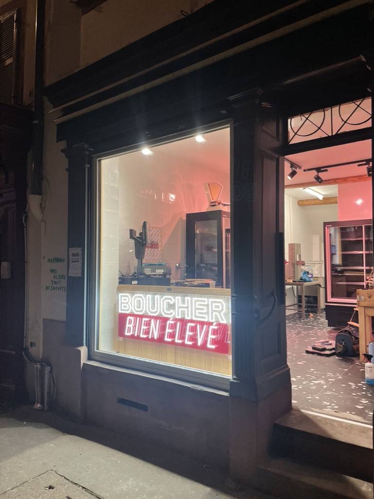 Ici une réalisation pour une boucherie à Strasbourg en Alsace qui souhaitait accroître sa visibilité avec la mise en place d'une enseigne néon sur son meuble principale. Placé derrière sa vitrine, cette enseigne ne nécessite aucune demande à la mairie et permet une réelle plus value dans la visibilité de cette boucherie ! La fabrication de cette enseigne est faite dans nos locaux à Strasbourg. Faite à partir de néon led, cette enseigne ne consomme pas beaucoup d'électricité en comparaison à du néon classique, pour un résultat tendance et originale !