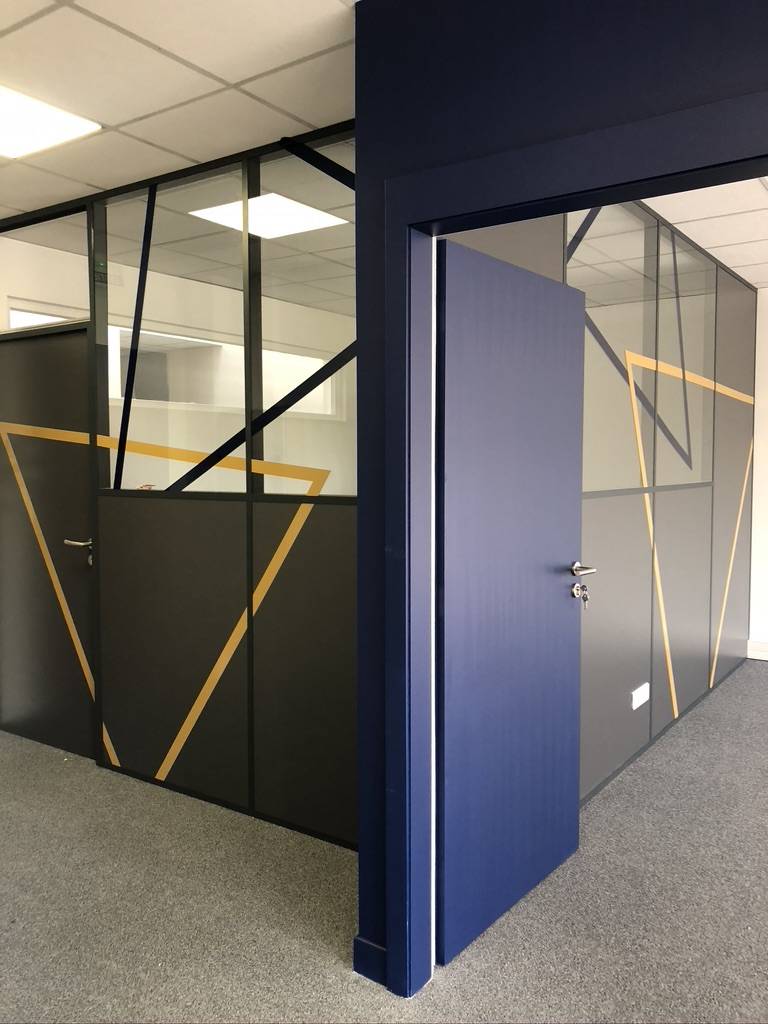 La vitrophanie est composée de bâtons graphiques en adhésif doré et bleu foncé, créant un rythme visuel élégant et moderne. Ce choix de couleurs renforce l’identité des bureaux tout en apportant une touche haut de gamme. L’impression a été réalisée dans notre atelier à l’aide de films adhésifs professionnels, garantissant une excellente tenue dans le temps et une finition irréprochable.