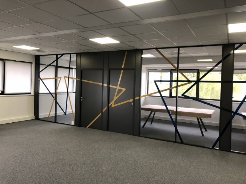 Chaque vitrophanie originale est conçue sur mesure en fonction des contraintes du lieu. Pour ce projet à Molsheim, proche de Obernai, nos équipes ont effectué un relevé précis des vitrages afin d’assurer une pose parfaitement alignée. Cette approche garantit un rendu harmonieux et cohérent dans l’ensemble des bureaux.