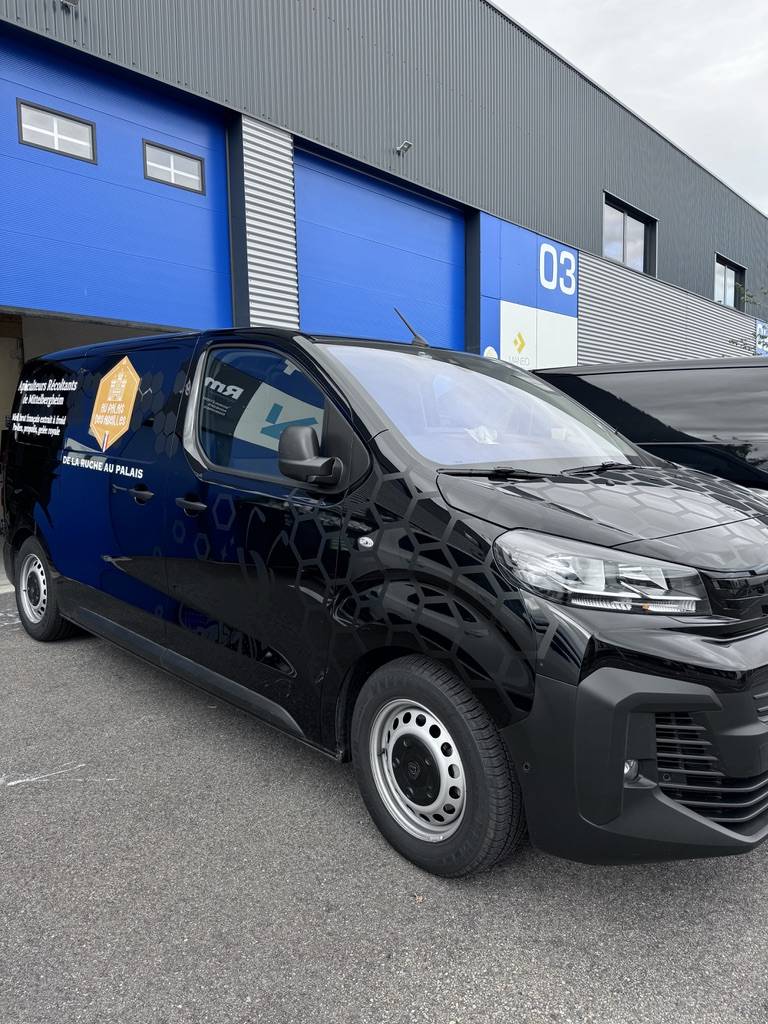 Le choix du noir mat combiné à des éléments colorés sur ce Peugeot Expert noir brillant permet de créer un contraste subtil et moderne, attirant l'œil sans être trop agressif visuellement. Cette approche permet de renforcer la notoriété de l'apiculteur dans la région de Colmar, tout en reflétant une image professionnelle et soignée.