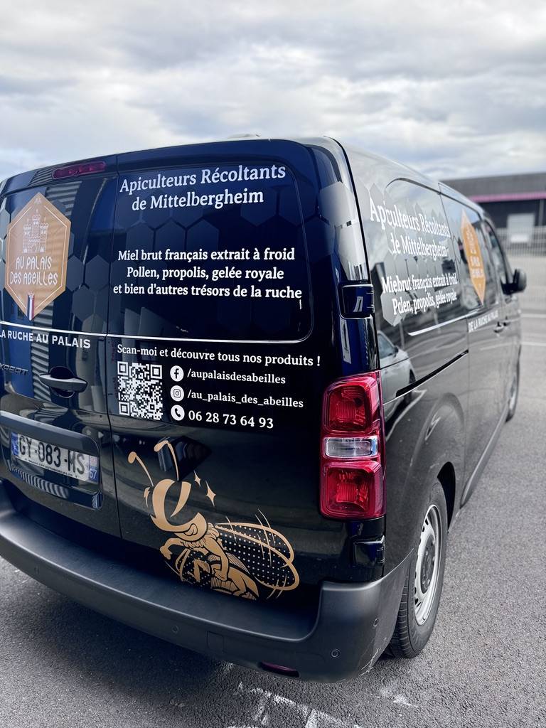 Le marquage publicitaire réalisé permet non seulement de mettre en avant l’activité de l’apiculteur, mais aussi d'assurer une visibilité optimale de son entreprise lors de ses déplacements dans Colmar et aux alentours. Grâce à l’utilisation d’un adhésif de qualité, conçu pour résister aux intempéries et à l’usure, ce véhicule utilitaire devient un outil de communication mobile puissant et durable.