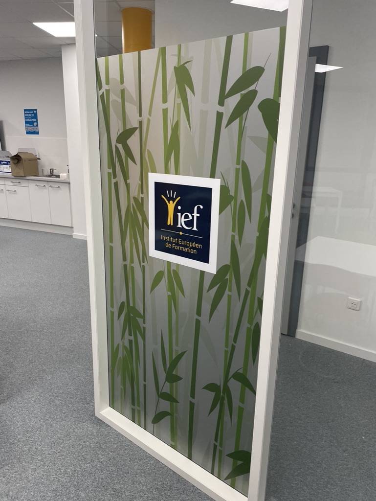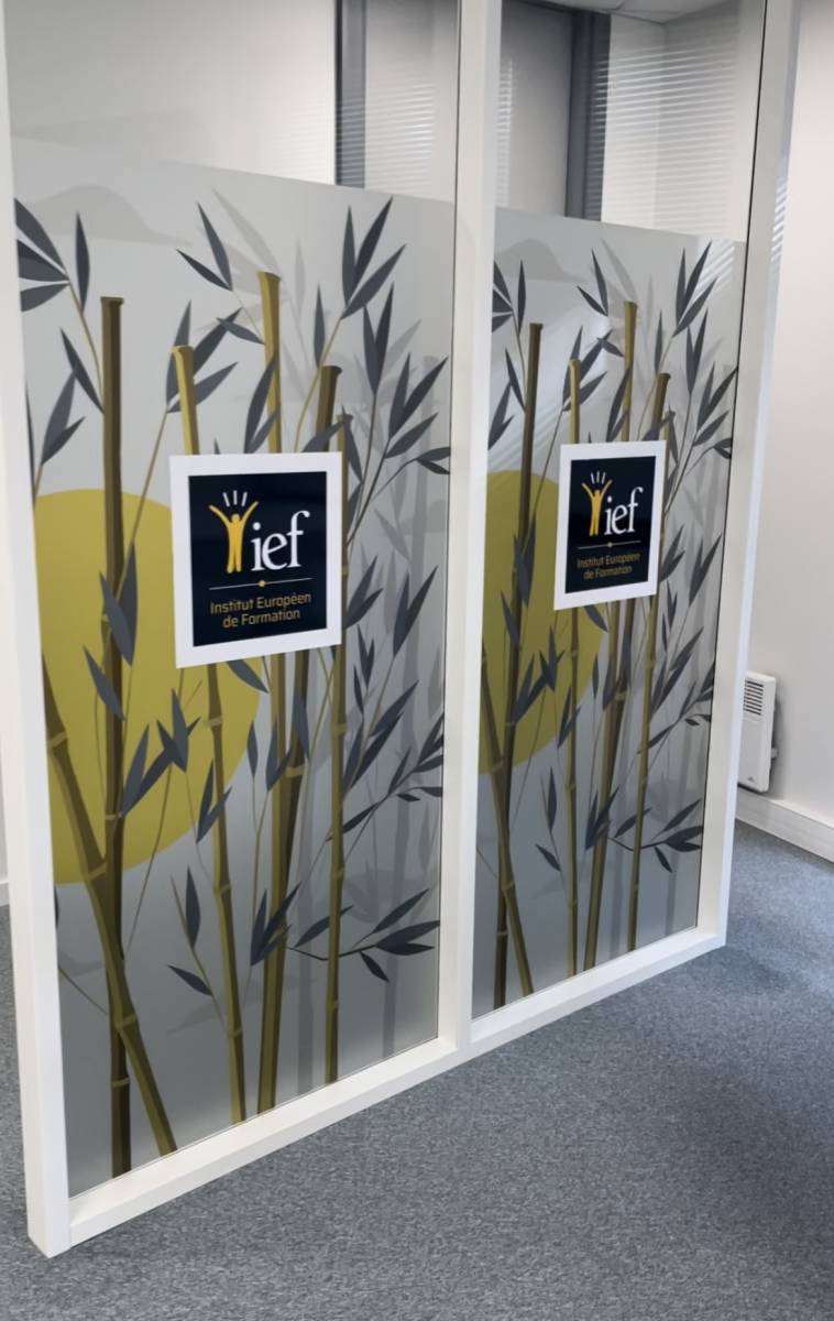 Cette école nous a contacté pour occulter ses grandes cloisons vitrées. Le but était d'apporter de l'intimité à ce lieux, tout en donnant vie à l'espace et en renforçant l'image de marque. Nous avons ainsi orienté notre client vers la pose de film occultant imprimé avec un design moderne et vivant, qui reprend le logo de l'école.